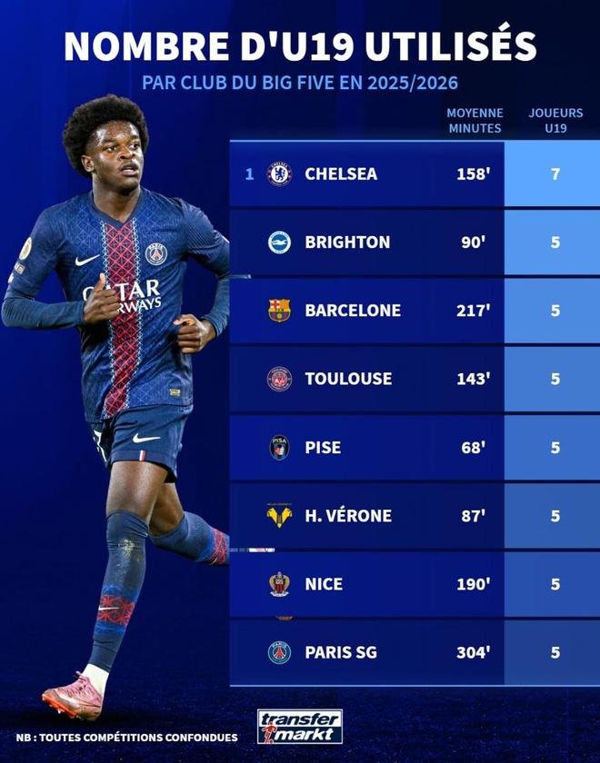 On October 7, the statistics of the transfer to Germany pointed out that Paris Saint-Germain is the club that gives players under 19 years the greatest game time of the five main clubs in the Europa League, while Chelsea is the club that most uses players under 19. According to German transfer statistics, Paris Saint-Germain coach Luis Enrique has used five U19 players in total this season, with a total of 304 minutes of game time, while Chelsea coach, Maresca,使用七个U19球员,总共比赛时间为158分钟。巴塞罗那也在名单上,一部电影为五名球员U19提供了217分钟的比赛时间。 U19俱乐部在五个大联盟中使用的8位最佳球员直到本赛季:切尔西7球员158分钟158分钟的德国5球员304分钟304分钟304分钟217分钟217分钟5分190球员143分钟143分钟5 90分钟5 90分钟球员Verona 5球员Verona 5球员87分钟68分钟68分钟68分钟68分钟68分钟68分钟68分钟68分钟68分钟68分钟68分钟68分钟68分钟68分钟68分钟68分钟68分钟68分钟68分钟68分钟68分钟68分钟