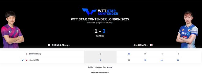 北京时间10月26日,WTT伦敦之星挑战赛女单半决赛,早田希娜以3-1战胜郑怡静,晋级决赛。四局比赛比分分别为11-13、12-10、11-6、11-6。早田将等待张本VS桥本的胜者,因此日本乒乓球锦标赛将首先获胜。 33岁的老将郑伊晶是本次WTT伦敦站的黑马。他的世界排名第16位。不过,他此前淘汰了世界排名第13位的韩国乒乓球选手申宥彬。他还击败了巴特拉和扎哈里亚,晋级半决赛。她是唯一一位参加本届伦敦赛半决赛的外籍乒乓球运动员。围绕在他身边的是日本乒乓球界的三位王牌。最终输给了早田,没有获得冠军。早田希娜是世界排名第14位的选手,她的世界排名高于33岁的郑怡静。然而在第一场比赛中两队之间,早田希娜落后。两队打得难解难分,但郑怡静逐渐取得领先,8-8、9-9。最终,郑怡静以13比11的比分拿下第一。第二场比赛,老将郑怡静反手战胜早田希娜。日乒最美战神以2-4、4-7落后,随后以6-9落败。早田希娜不想放弃。他努力拼搏,将比分追至8-9。此后,郑怡静连续出现正手失误,结果非常致命。早田希娜将比分追成12-10。第三局早田希娜以1-0领先,此后早田希娜以4-2领先,而郑艺静则以5-7继续落败。早田雏似乎已经适应了郑怡静的攻击。郑怡静反手将比分追成6-7后,早田希娜爆发以4-0拿下比赛。第四局开局,郑艾静4-3领先,但郑艾静个人失误明显增多。早田希娜有 already以6-5领先,8-6,早田希娜将领先优势扩大到两分。此后,早田希娜连续拿下三分,以11-6获胜。